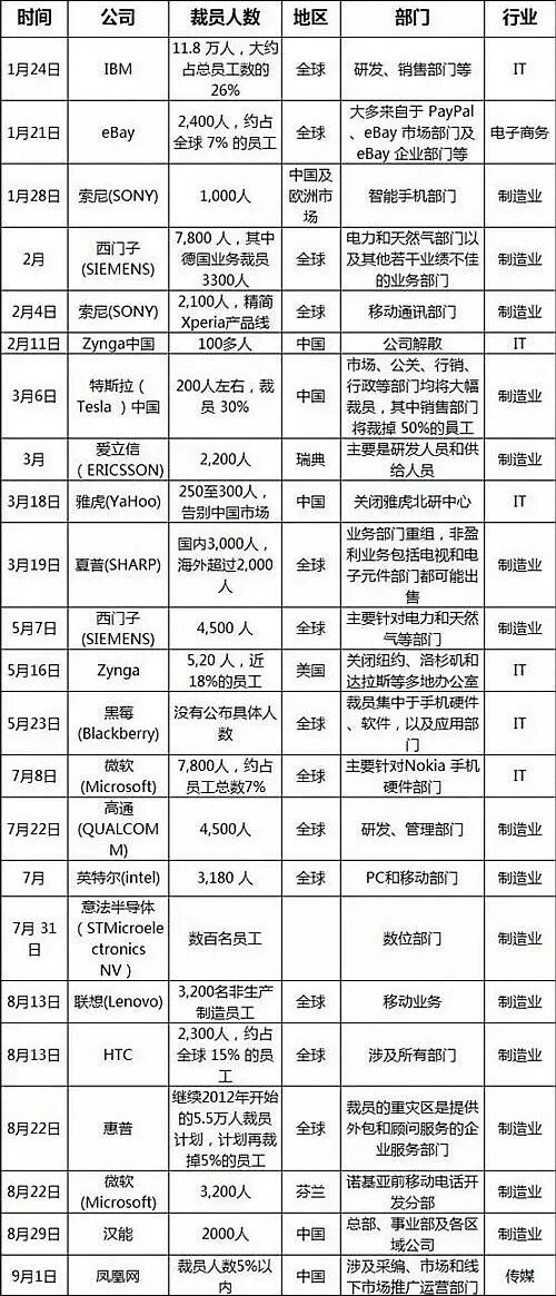 截至2015年上半年期间,IBM在全球范围内裁员11.9万人;eBay裁员2400人;索尼在中国及欧洲市场裁员7800人‘爱立信裁员2200人;微软裁员3200人;英特尔裁员3180多人;HTC裁员2300多人。