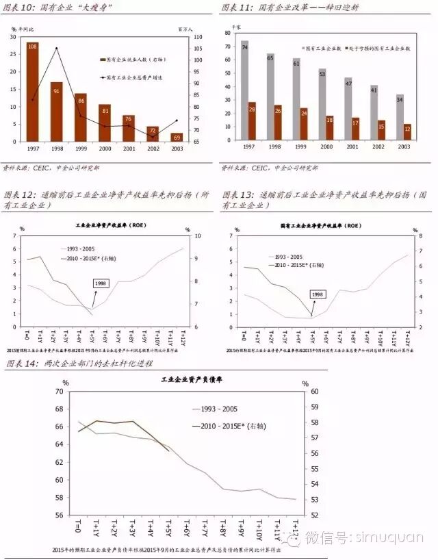 国有企业改革有效淘汰了制造业的过时和过剩产能。期间国有企业员工数量减少逾3千万,国有工业企业数量下降约4万家。同时,国企改革在国有和私营企业之间引入更多竞争,极大地提高了企业部门的效率。与此同时,新成立的四大资产管理公司发行了共计1.06万亿元的专项金融债券,帮助国有商业银行进行债务重组和恢复放贷能力。
