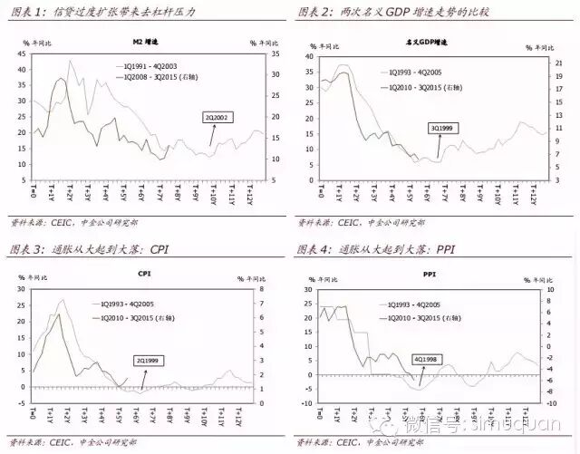 中金公司近期的一份报告认为,1998-2002年长期通缩期和当前很相似,当时中国的货币和财政政策均大幅宽松,同时推行供给端改革,让经济进入了持续复苏轨道。当前增长放缓和通缩压力日益加大,中国政府料将加大逆周期政策的力度,并推行市场化的结构性改革。