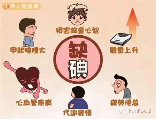 碘是参与甲状腺合成、维持人体新陈代谢的必需元素,主要膳食来源为海产品,缺乏碘导致身体多系统(如神经、内分泌等)机能衰退,因此有碘缺乏风险的居民需食用加碘盐(4)。