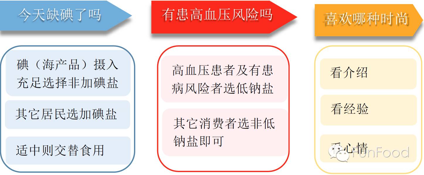 读懂配料表:钾、碘、钠,不同产品性状有差异,主要是自己买的开心; 过度摄入盐有增加高血压的风险; 非低钠盐的产品97%都是氯化钠,高端产品属于调味品,但不是功能保健品; 低钠盐适于高血压消费者,普通消费者根据自身情况(口味重的童鞋请重点考虑)选择是否减少钠摄入,除低钠盐以外可以通过减少放盐来减少钠摄入。但是高温、高强度工作者,服用降压药的人、肾功能障碍者需要慎用低钠盐; 是否选择加碘盐,取决于是否有碘缺乏风险。膳食中海产品较少的人群(如,内陆地区居民)相对更需要补充碘。