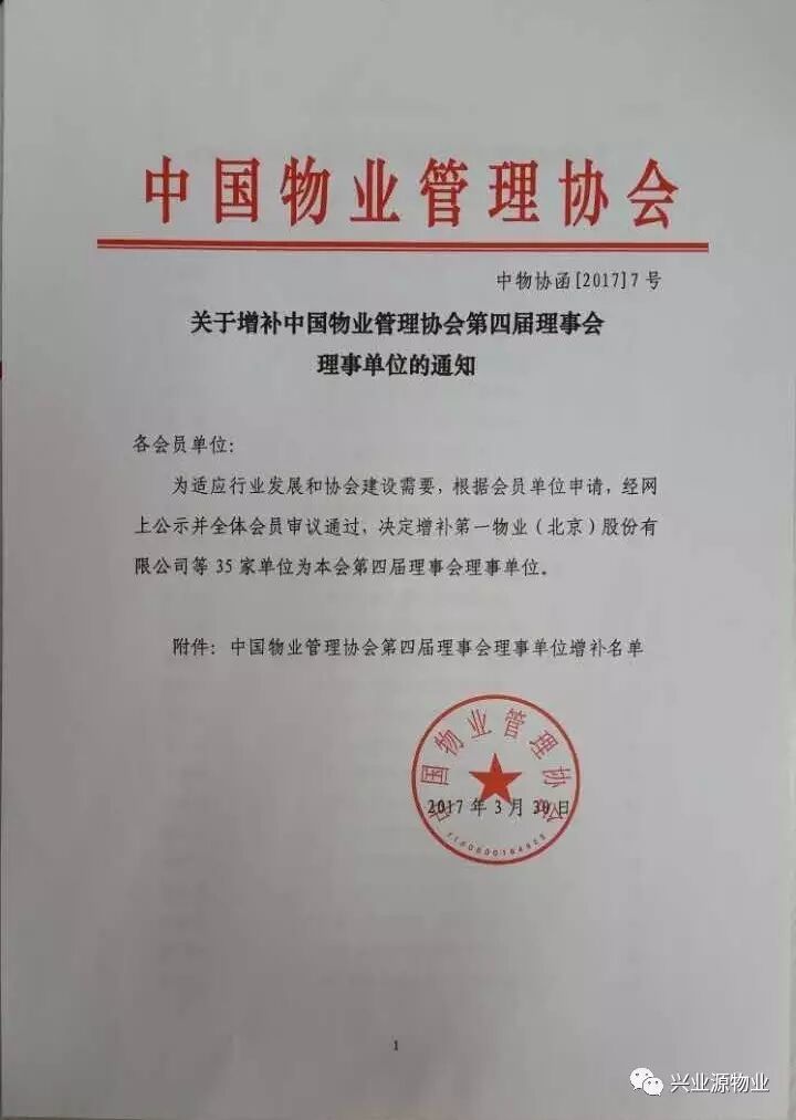 2017年4月,北京兴业源物业管理有限公司收到通知正式被增补为中国物业管理协会第四届理事会理事单位。