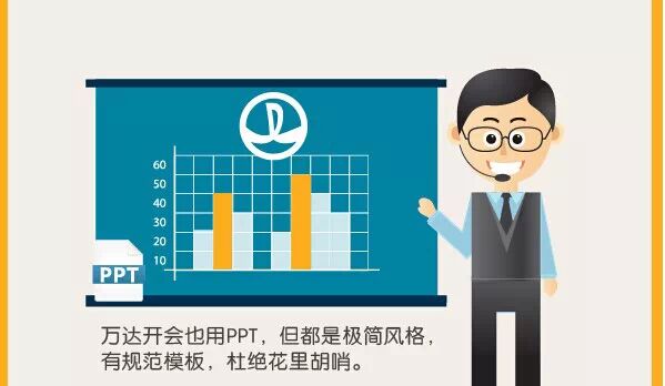 万达开会也用PPT,但都是极简风格,有规范模板,杜绝花里胡哨。一般开会不许超过10张,给董事长、总裁汇报基本不会超过3张。当然这3张都是筋骨,筋骨后基本上都有超链接,如果领导问细节,后面有更细的。