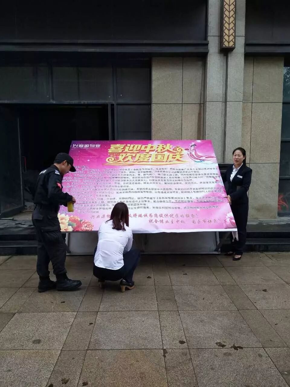 为迎接国庆、中秋双节,兴业源物业的工作人员张灯结彩挂国旗、宣传标语,将管辖区内布置成一派喜气洋洋的节日氛围。为保证管辖区内业主度过一个安全、和谐的国庆、中秋双节长假,体现公司人性、关爱的服务理念,兴业源物业所管理的各个辖区服务处经理严格要求各部门做好节假日期间各项安全、消防、门禁、环境等工作,各部门主管提前对各项设备系统进行全面检查,对门禁以及易损部件提前做好备品备件,并在假期间安排值班人员。