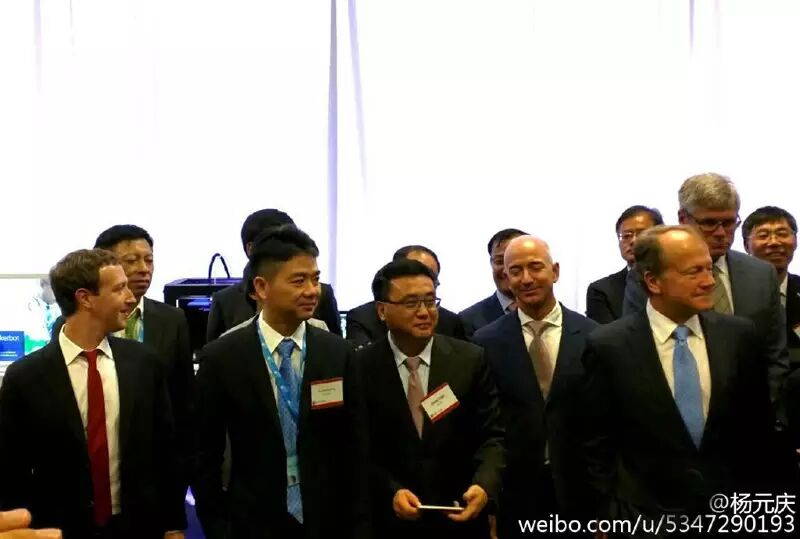 论坛上的扎克伯格(左一)、刘强东(左二)、张亚勤(左三)、亚马逊创始人杰夫-贝索斯(左四)等人。