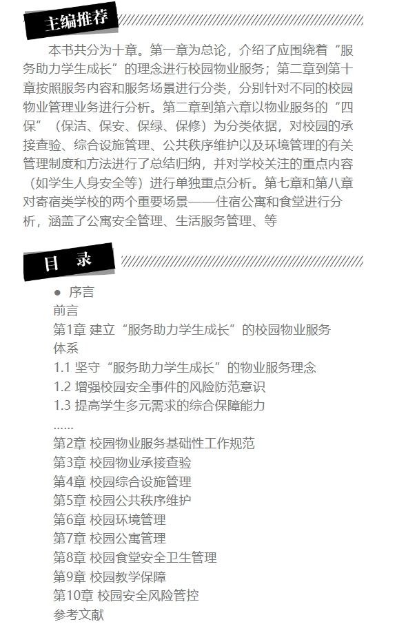 在校园教学保障方面,书中强调了物业服务在支持教学活动中的重要角色,同时针对校园安全风险管控提出了一系列有效的策略和措施,以预防和应对各种潜在风险,确保校园的整体安全。本书不仅是物业管理专业人员和校园管理者的宝贵资源,也对教育行政部门和政策制定者开展工作具有参考价值,为提升寄宿类学校的物业服务质量和效率提供了理论支持和实践指导。