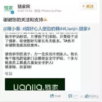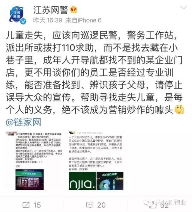 这则消息宣称:从5月25日起,链家全国6000家门店将成为中国“失联儿童守护站”,请家长告诉孩子,只要与家人走失,就去链家,那里的员工会保护孩子,帮孩子回家…… 然而,这则目前确实是来自链家官方的“广告”,却引起了警方的强烈反感。