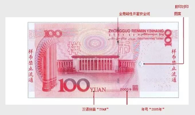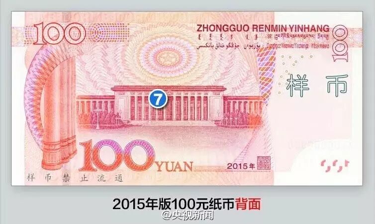 2015年版第五套人民币100元纸币在保持2005年版第五套人民币100元纸币规格、正背面主图案、主色调、“中国人民银行”行名、国徽、盲文和汉语拼音行名、民族文字等不变的前提下,对部分图案做了适当调整,对整体防伪性能进行了提升。