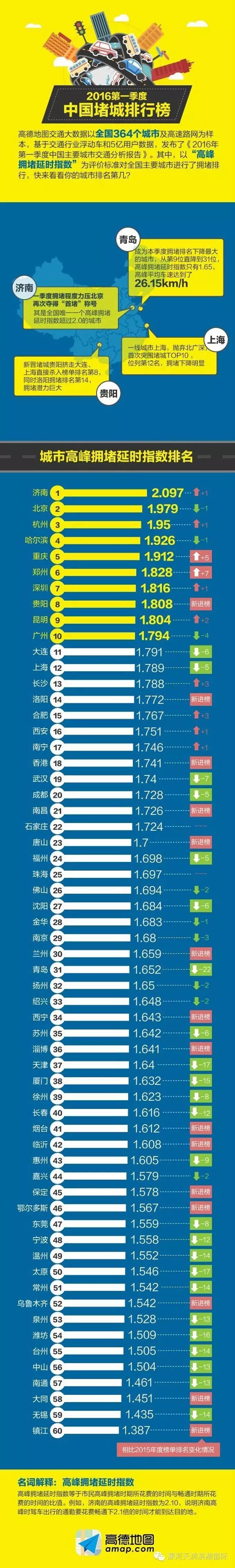 同时,报告还公布了2016年度第一季度中国堵城排行榜,首次揭示了Top60榜单。榜单显示,此次堵城排名,济南继去年三季度之后,再次超越北京位居榜首,而其它进入Top10的城市依次为北京、杭州、哈尔滨、重庆、郑州、深圳、贵阳、昆明、广州。