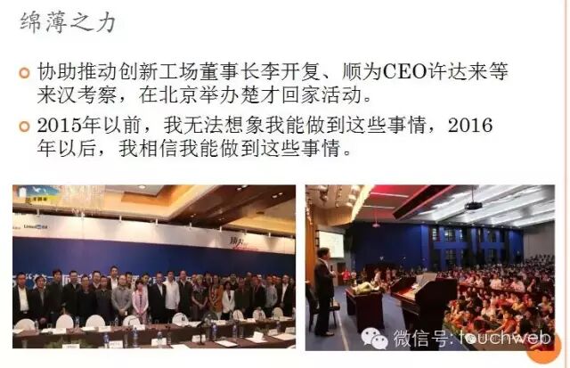 在这之后,我相继协助光谷夏主任、李局长、夏局长一起推动创新工场董事长李开复、顺为CEO许达来来武汉考察,在北京举办楚才回家活动。总体而言,取得了很不错的效果。