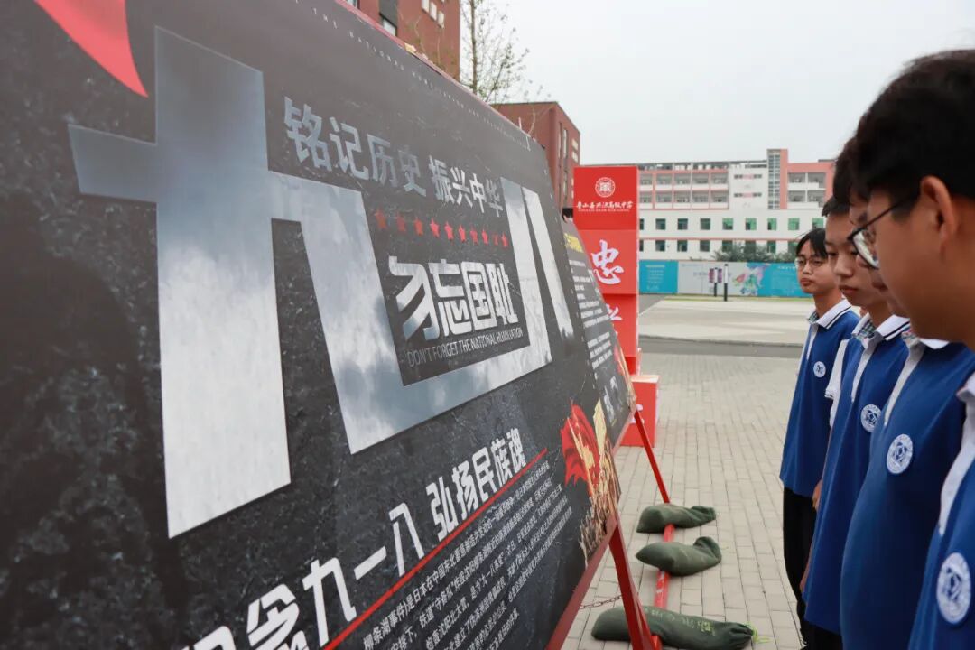 学校在校园各处摆放宣传展板,学生利用课余时间学习历史知识,了解“九一八”事变的背景、过程及影响,一起回望历史。