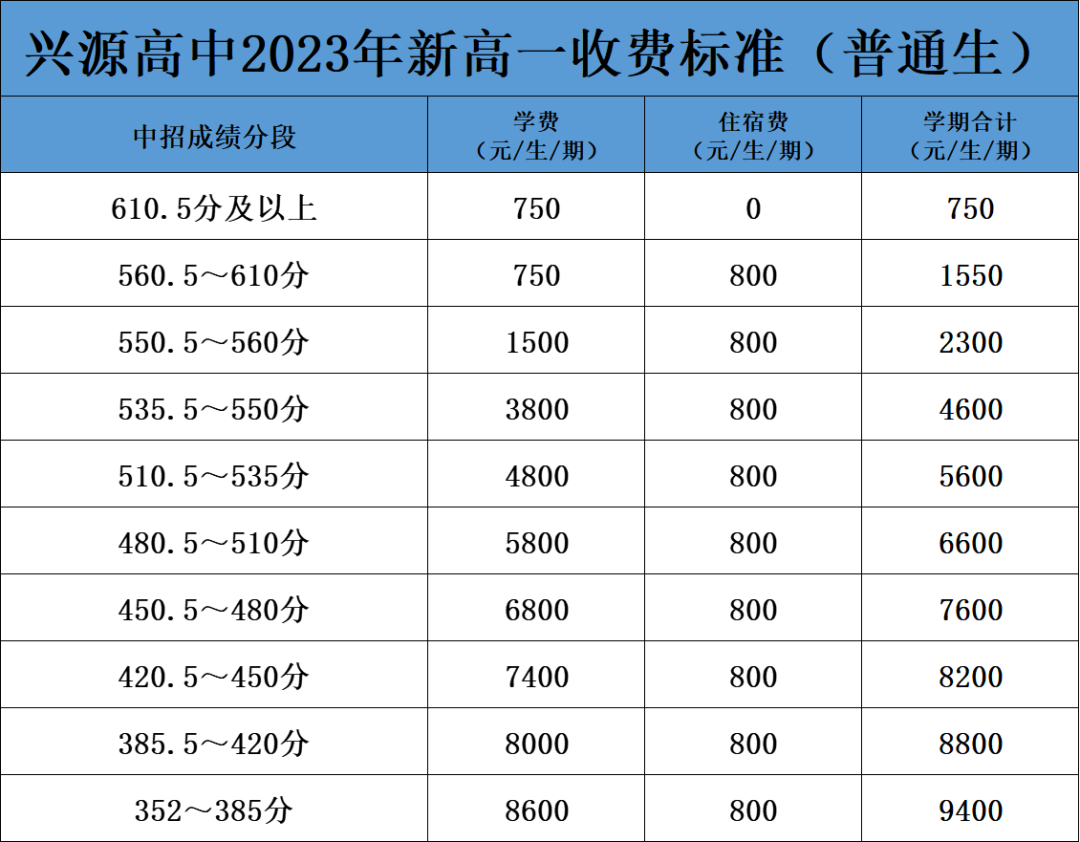 2023年新高一普通生收费标准