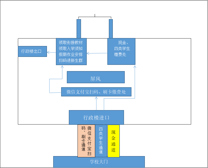 ●缴费→领取收据→领取衔接教材→扫码进新生群→签订承诺书→有序离校