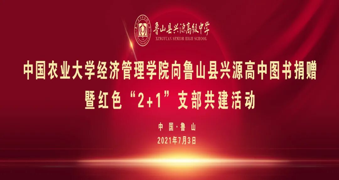 传承红色基因,献礼建党百年。7月3日,中国农业大学经济管理学院向兴源高中图书捐赠暨红色"2+1"支部共建活动捐赠仪式在兴源高中报告厅隆重举行。鲁山县县委书记杨英锋,平顶山市社会建设委员会主任王洪宇,县委常委、宣传部长刘万福,县人大副主任许杰,副县长杨洪峰,县政协副主席邢春瑜,县教体局局长李怀海,中国农业大学经管学院分党委副书记朱葛军,中国农业大学经管学院副院长任金政,中国农业大学经管学院工会主席陶益清,中国农业大学经管学院教授、北京市名师臧日宏,中国农业大学经管学院工会委员揣君健,北京兴源集团董事长、兴源高中创始人陈永杰,北京兴源集团总经理、兴源高中董事长庞宏垣,北京化成天下公益基金会理事长陈宝峰,兴源高中校长樊红伟参加活动。活动由兴源高中党总支书记付红娜主持。