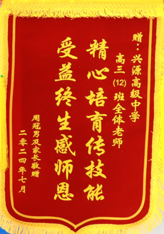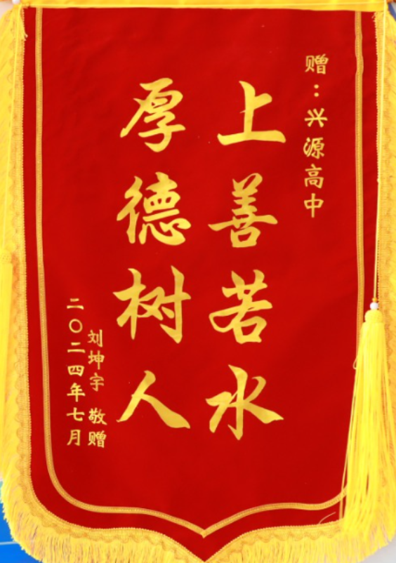 在这个充满感恩情怀的八月,兴源高中2024届毕业生家长代表为我校赠送锦旗,感谢学校的辛勤栽培让孩子高考能取得优异成绩! 感谢老师们对孩子三年来的精心培养和付出,向母校及恩师敬赠锦旗,共同分享收获的喜悦。