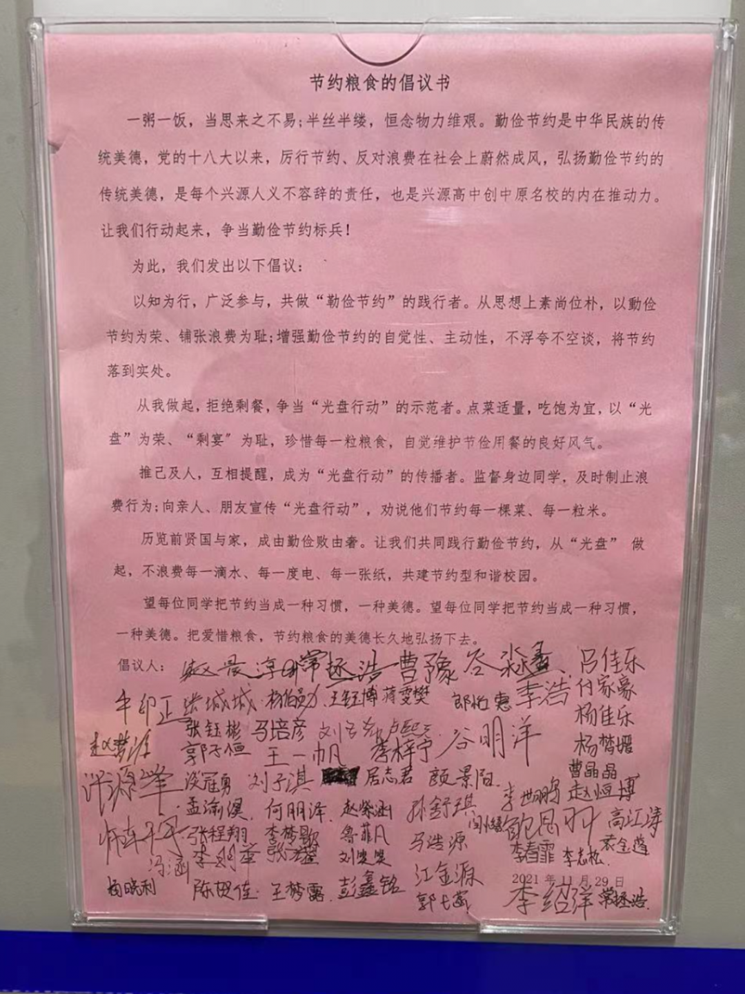 高一年级学子签写节约粮食倡议书