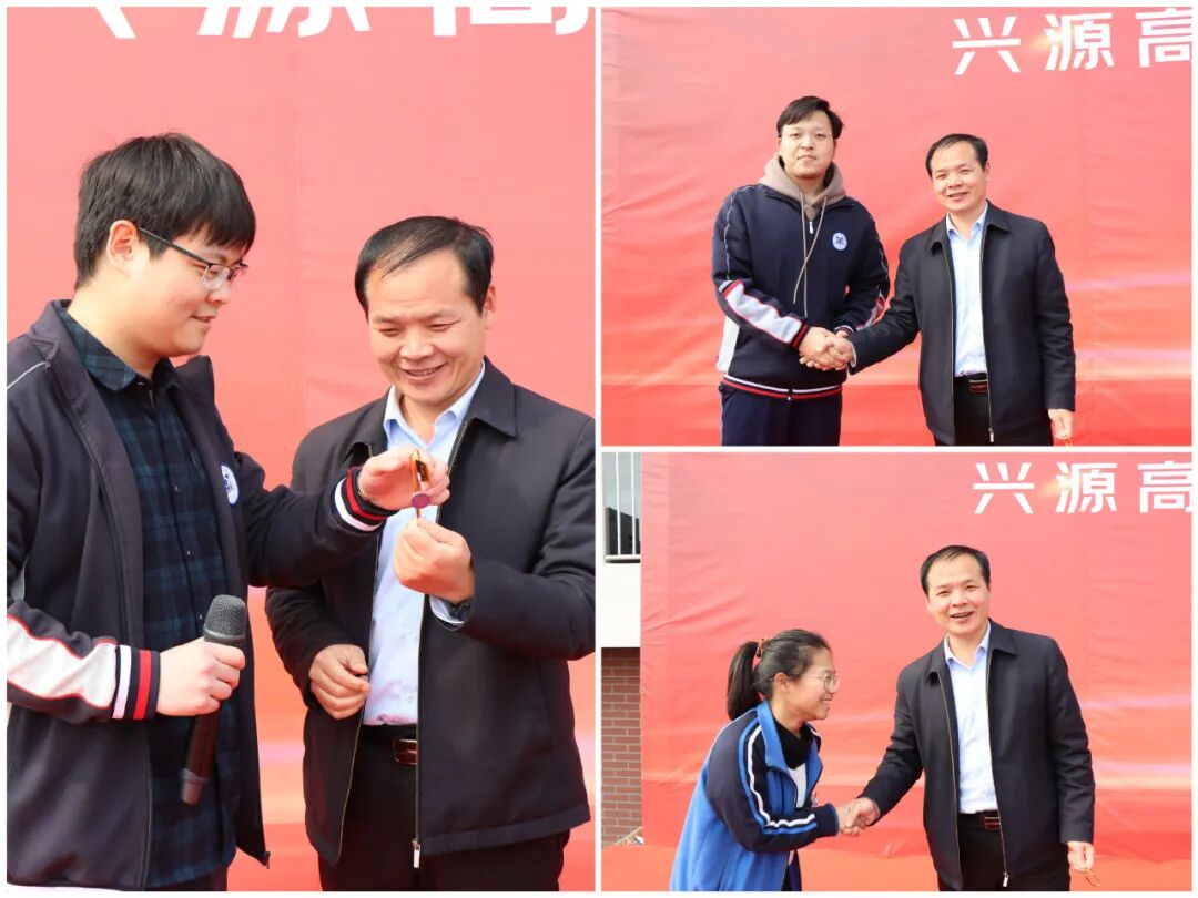 为了点燃学生的家国情怀,激发全体同学奋发向上的“精神气”,樊校长拿出珍藏许久清华北大书签奖励现场背诵《满江红》的学生们。同学们拿到奖品后开心满怀的和校长握手合影。