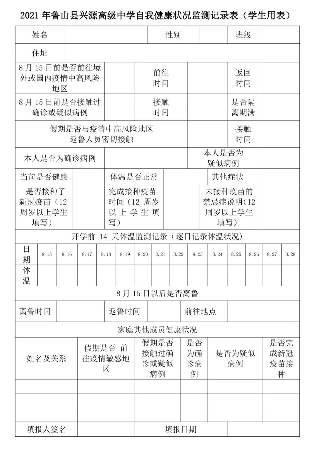 我校已要求学生在家连续监测体温至少14天,到校当天,请将以下纸质材料交班主任:《健康状况检测记录表》(8月15日起)、《行程码》、《健康码》(日期为到校前一天)和《健康承诺书》(日期为到校前一天)。(所有上交材料,请各位家长按照时间节点居家为孩子做好纸质记录,返校时学生持原始记录,到校后经班主任查验后,方可入校。)