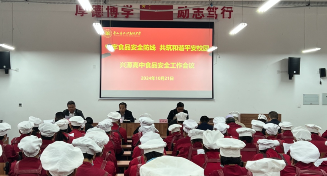 校园食品安全关乎每一位师生的饮食健康,为提升学校食堂服务人员的食品安全意识,2024年10月21日下午,兴源高中组织全体食堂员工召开食品安全工作会议。校长樊红伟、综合办公室主任邵永鹏、餐厅经理张明明和食堂全体工作人员参加会议。