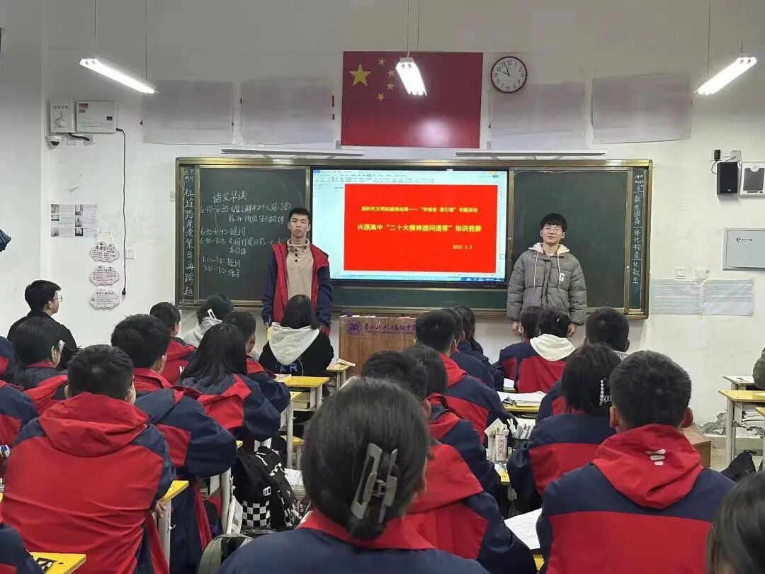 3月2日,在新时代文明实践推动周——“学报告 强引领”专题活动中,兴源高中举办了“二十大精神速问速答”知识竞猜活动。学生两两走上讲台,展开竞猜,再次掀起党的二十大精神学习热潮。