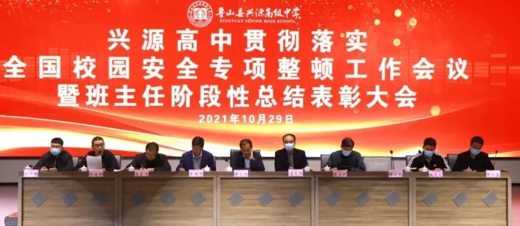 近日,全国校园安全专项整顿会议以视频形式顺利召开。会议强调,要深入学习,贯彻习近平总书记重要指示精神,增强"四个意识”、“四个自信”、做到“两个维护",全面排查校园安全隐患,如期完成专项整顿任务,切实维护师生健康、校园安全、社会稳定。为此,兴源高中在2021年10月29日晚召开“贯彻落实全国校园安全专项整顿工作会议暨班主任阶段性总结表彰大会”。兴源高中校领导及学校各部门安全负责人、全校班主任共同参会。会议由教导处主任潘庆丰主持。