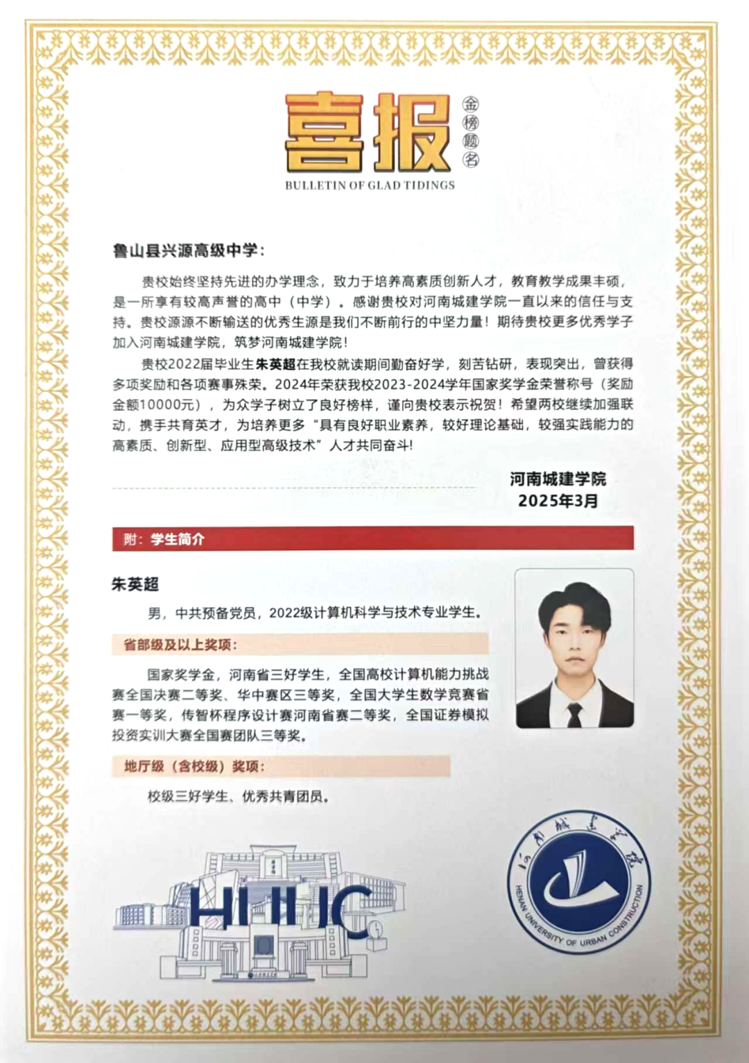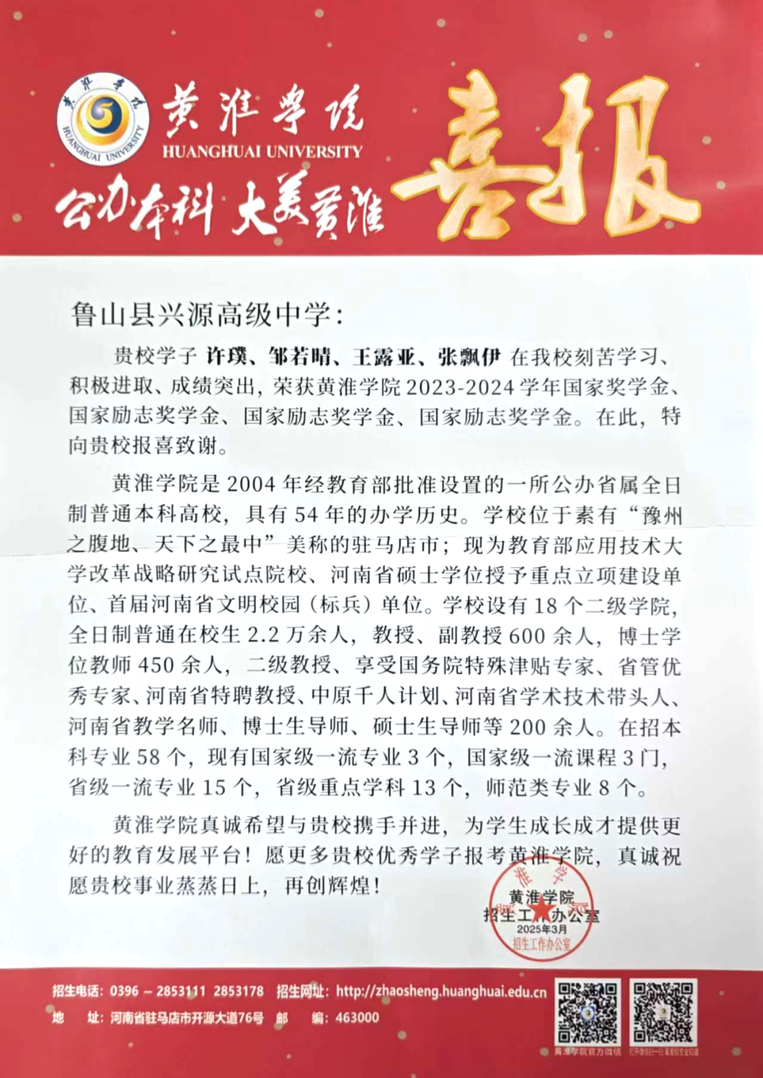 近日,兴源高中陆续收到河南城建学院、黄淮学院发来的喜报,兴源高中优秀校友在高校表现卓越,荣获国家奖学金、国家励志奖学金、河南省三好学生等荣誉。