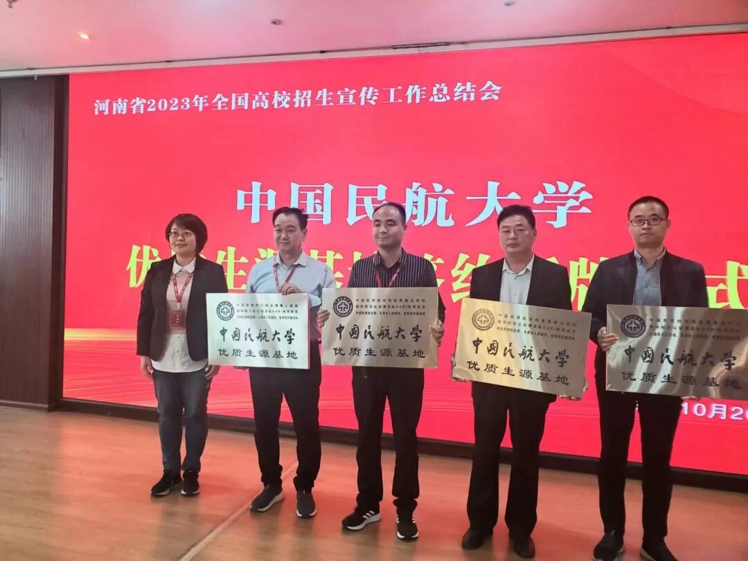 “中国民航大学、河南科技学院两所高校授予我校“优秀生源基地”牌匾,是对我校办学成绩的认可,对学校全体教职工辛勤付出的鼓励,也是对我校教育教学工作的高度评价,标志着两校结成了友好的长期的共赢的生源合作关系,为我校实现高质量发展注入了新的活力,也为我校今后优秀毕业生的去向提供了更加宽广的平台。学校将以此为契机,继续紧密合作,秉承两校优良传统,突出办学特色,打造高质量教学品牌,共同书写新时代育人新篇章。”学校教导处主任潘庆丰表示。
