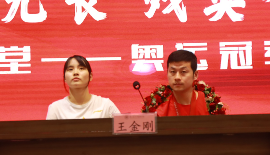冠军王金刚妈妈向同学们讲述王金刚成长史,回忆着一路的艰辛,忍不住流下了幸福的眼泪。王金刚克服常人难以想象的困难,不仅锻炼学会用脚在本上写出工整的字,还学会了用脚拿东西、炒菜做饭,学会了骑自行车、游泳,并顺利完成了小学、中学的全部课程。2008年开始学习游泳后,龚妈妈在60元一间的地下室,一住就是5年,用伟大的爱和陪伴影响和感动着王金刚。在母亲龚花整的鼓励支持和陪伴下,王金刚多次代表国家、省、市参加比赛,获得骄人成绩。先后4次参加残奥会,累计夺得3枚金牌、1枚银牌、2枚铜牌。