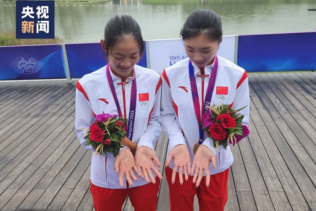 这其实是赛艇运动员的“标配”。她的队友邱秀萍,双手同样满是沧桑。两人一起为中国队拿下杭州亚运会首枚金牌。