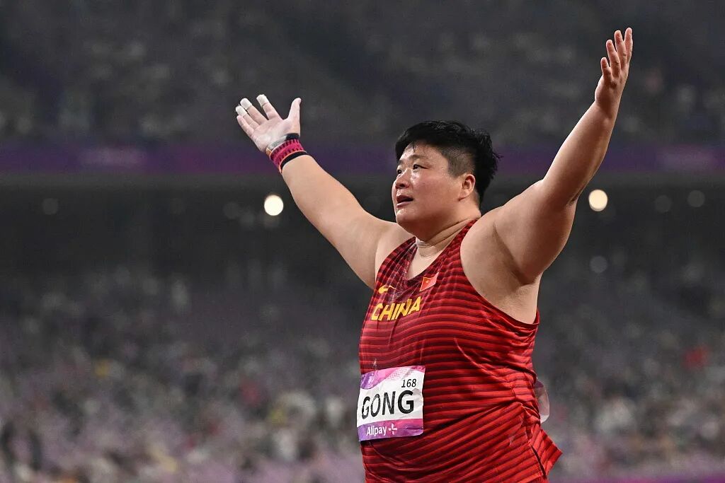田径女子铅球决赛,巩立姣夺得冠军,实现亚运会上的三连冠。当她完成最后一投,现场响起了她曾经唱给自己的《勇气》。