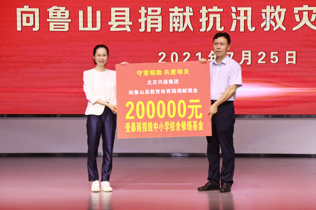 此次捐赠活动由北京河南鲁山企业商会会长单位北京兴源集团首先发起,会员单位纷纷响应。北京河南鲁山企业商会、北京兴源集团共向鲁山县人民政府捐赠抗洪救灾资金50万元,其中:北京兴源集团捐赠的30万元,有20万元定向用于鲁山县教体局去修缮受洪灾损毁的校舍和救助受灾家庭学生,有10万用于县公安局购买抗灾物资。