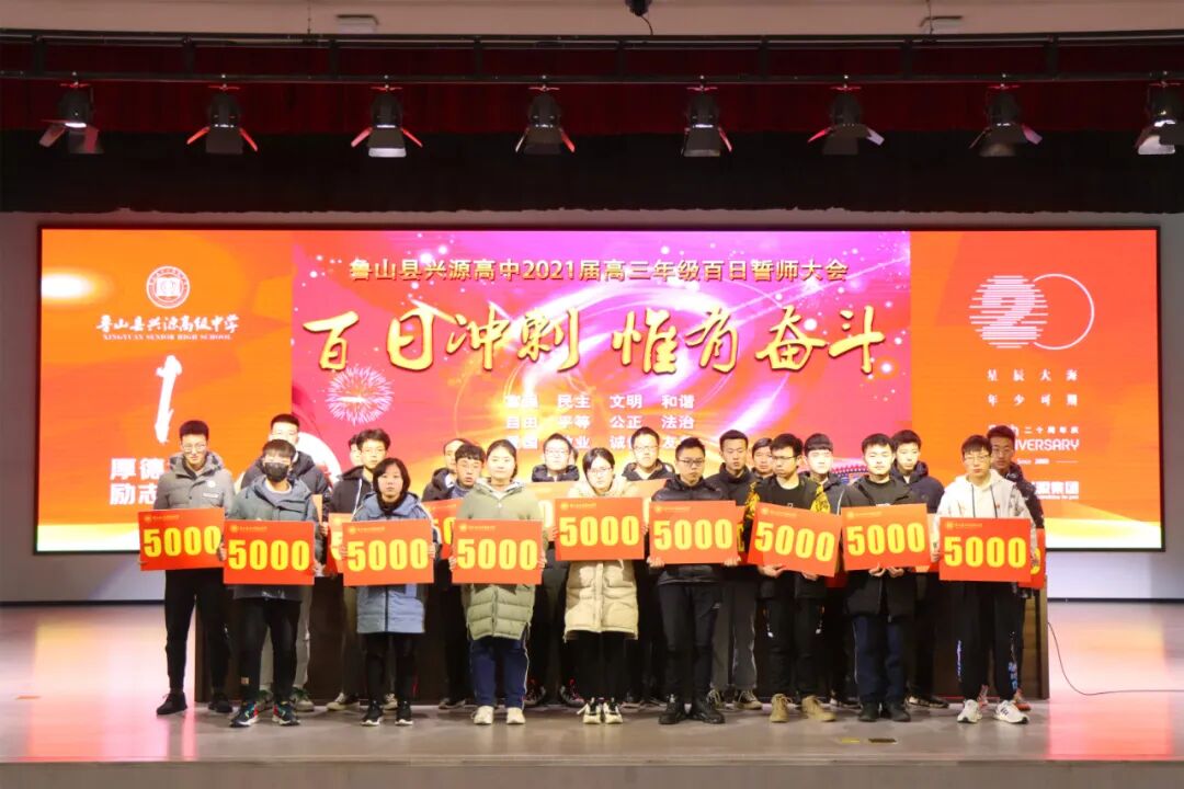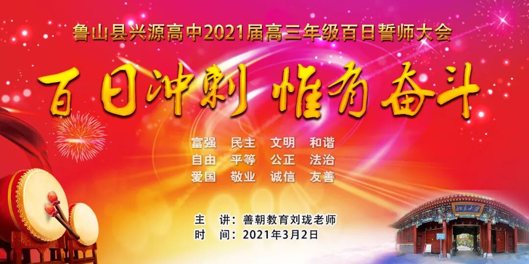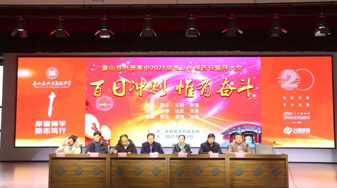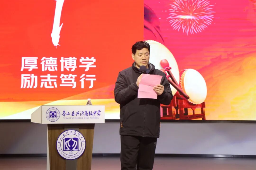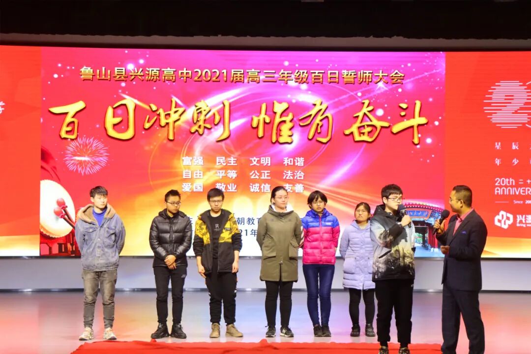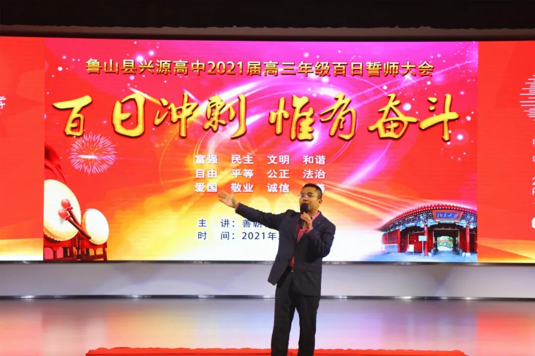 樊校长首先代表兴源高中领导班子向厉兵秣马、全力追梦的高三师生致以崇高的敬意和诚挚的感谢!向进入一轮复习的高二年级同学们表示祝贺!也向高一年级同学们表示问候,祝大家牛年吉祥!学业进步!他指出2021年是农历的牛年,牛年有着“勤劳勇敢、任劳任怨、坚韧不拔、开拓向前、丰收美满”的象征寓意。而在中华民族此时的时光表盘上,它更是“两个一百年”的交汇点,身在新时代新征程的同学们何其荣幸;在他们的成长历程中,这也是从青年向成才进阶的转折点,面对新高考新挑战,是何其豪迈!在距高考仅有100天的时刻,我们百日冲刺惟有奋斗!樊校长勉励大家要认真把握好未来的100天,100天可以突飞猛进,100天可以破茧化蝶,100天可以收获累累,希望同学们锐意进取,奋勇拼搏,剑锋所指,所向披靡,不懈奋斗,再创辉煌!一、学会分解你的目标,从压力中找动力,强化三心一力教育(自信心、感恩心、责任心、抗挫力)。二、戒骄戒躁,稳扎稳打,借助老师的力量、刷题的数量、自学的质量,纠错的深度,悟道提取的高度。三、背默课本强化基础典型习题过关,咬紧牙关努力奋斗!同学们,让自信陪伴梦想一起飞翔,让我们挺直年轻的脊梁,用越来越好的成绩去赢得2021,掀起兴源高中高考元年的波澜壮阔!你们将成为兴源高中历史上新的璀璨星辰!