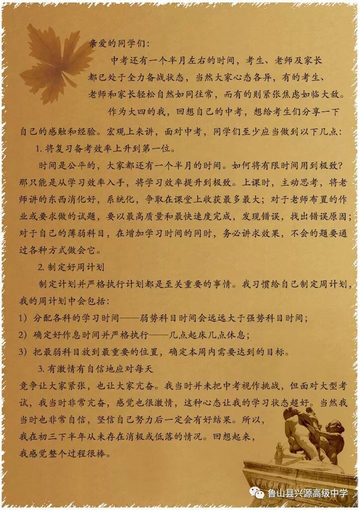焦虑、压力、紧张等不良状态充斥着每一名初三学生,在距离中招考试还有最后一个月的时间里,和大家分享一下清华优秀学子张培森的学习原则、语数英学习方法,以及心态的自我调节。有很多可以借鉴的内容,希望大家可以参考经验,汲取适合自己的部分,冲刺中考!