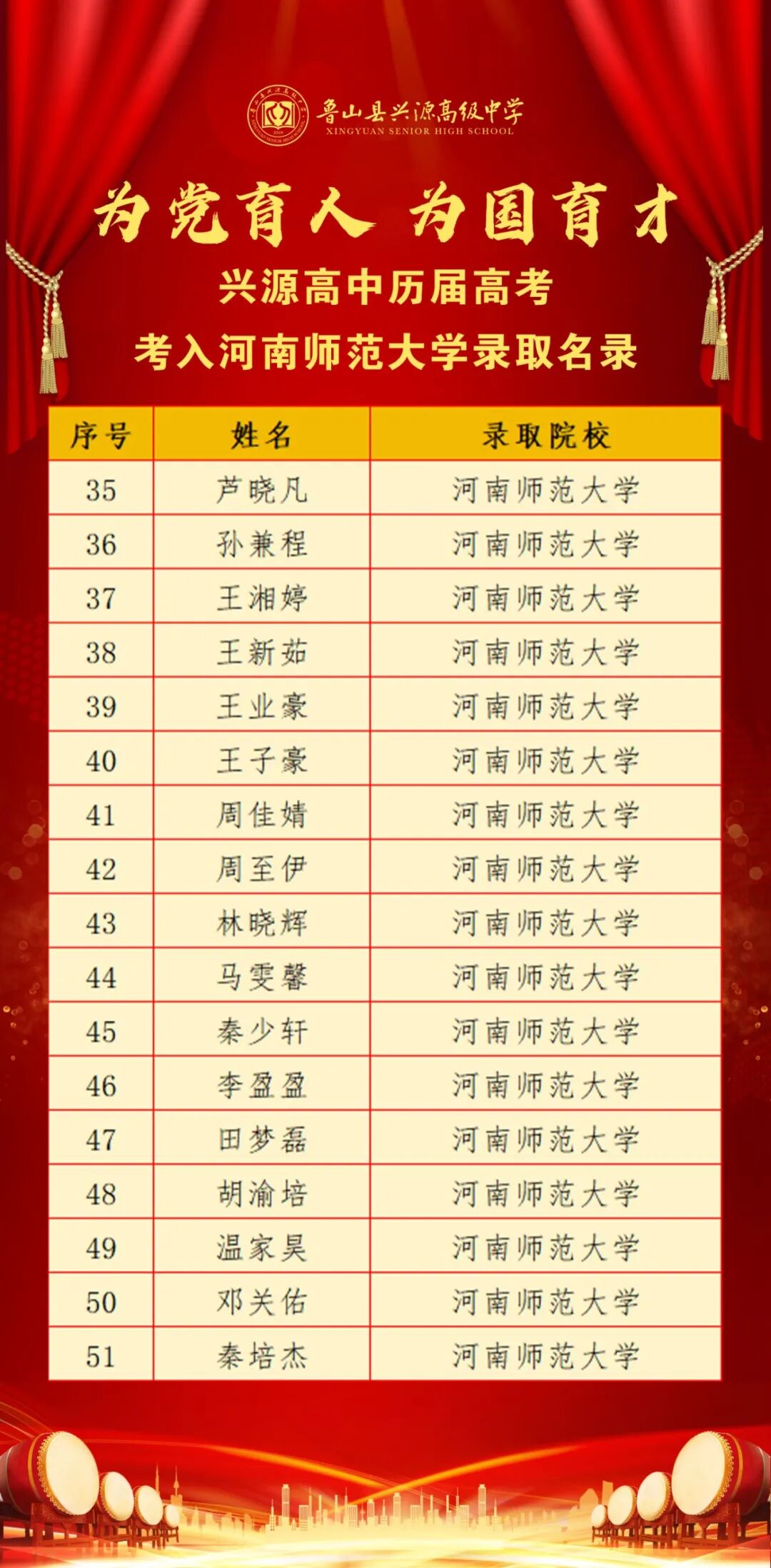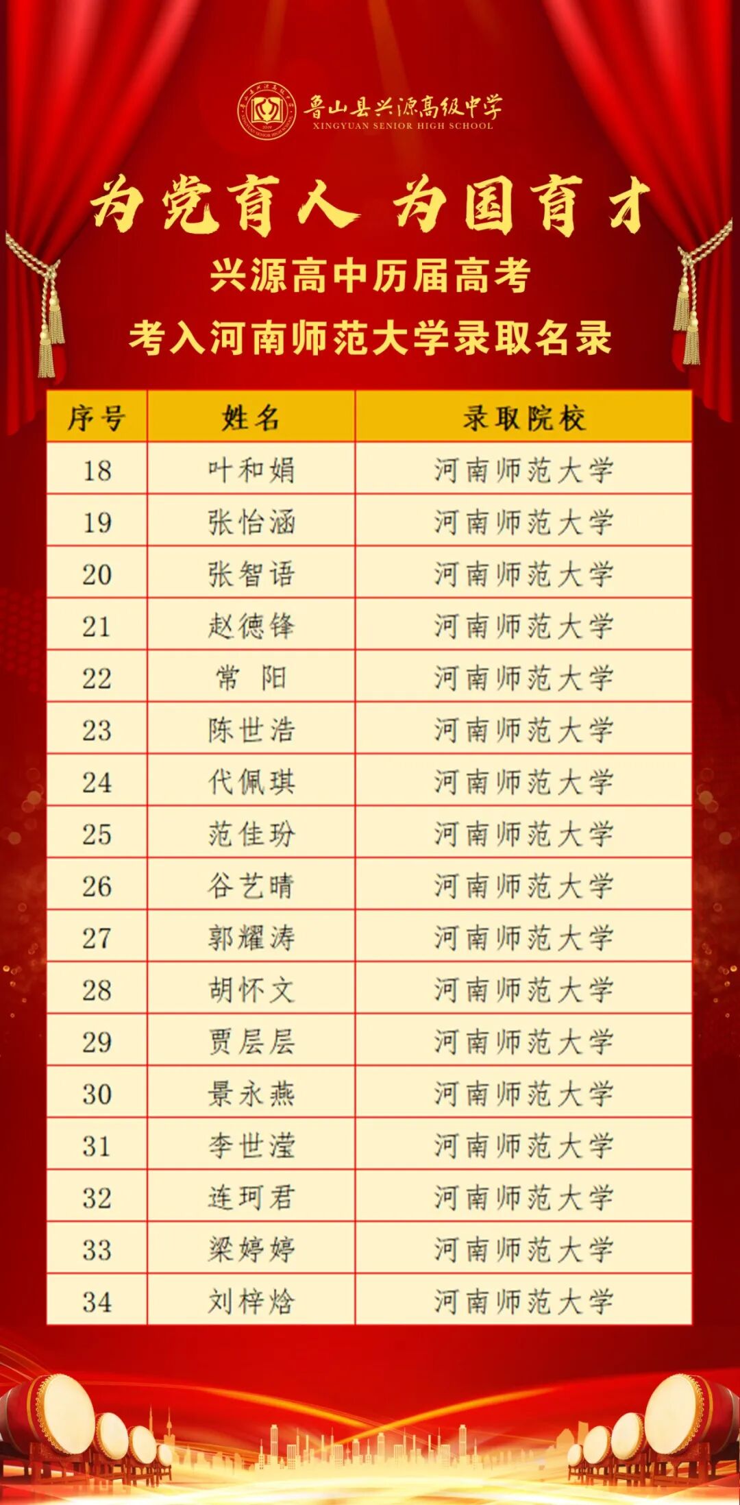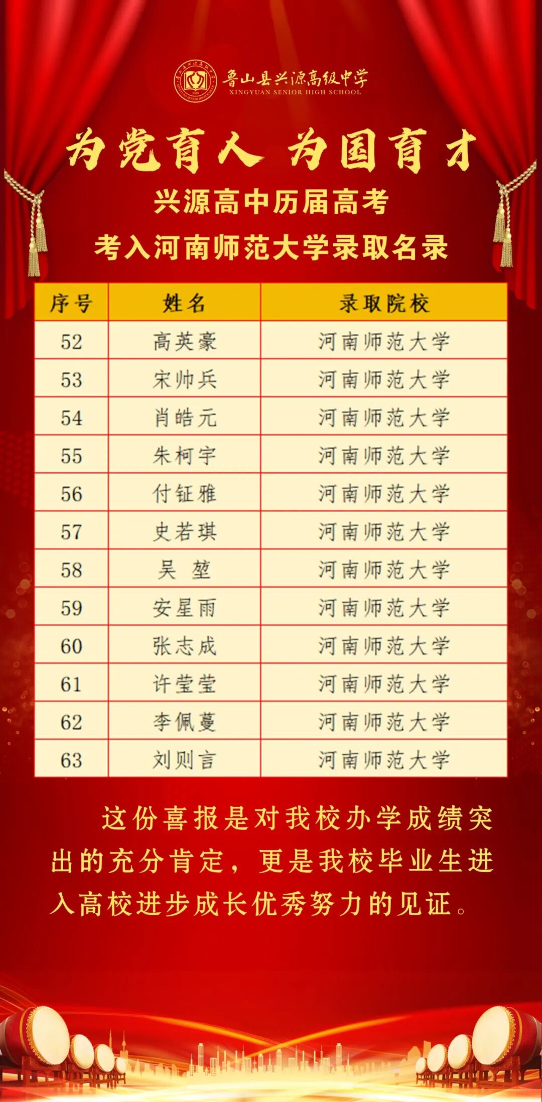 兴源高中办学五年来,相继有63名学子纷纷考入河南师范大学,学校在艺体培养方面,已与河南师范大学达成艺术共建;在师资队伍建设方面,河南师范大学培养的毕业生占比较高,为我校优秀教师队伍输送了优质人才。另外,学校被河南师范大学授予“优质生源基地”、“专业实习基地”称号。