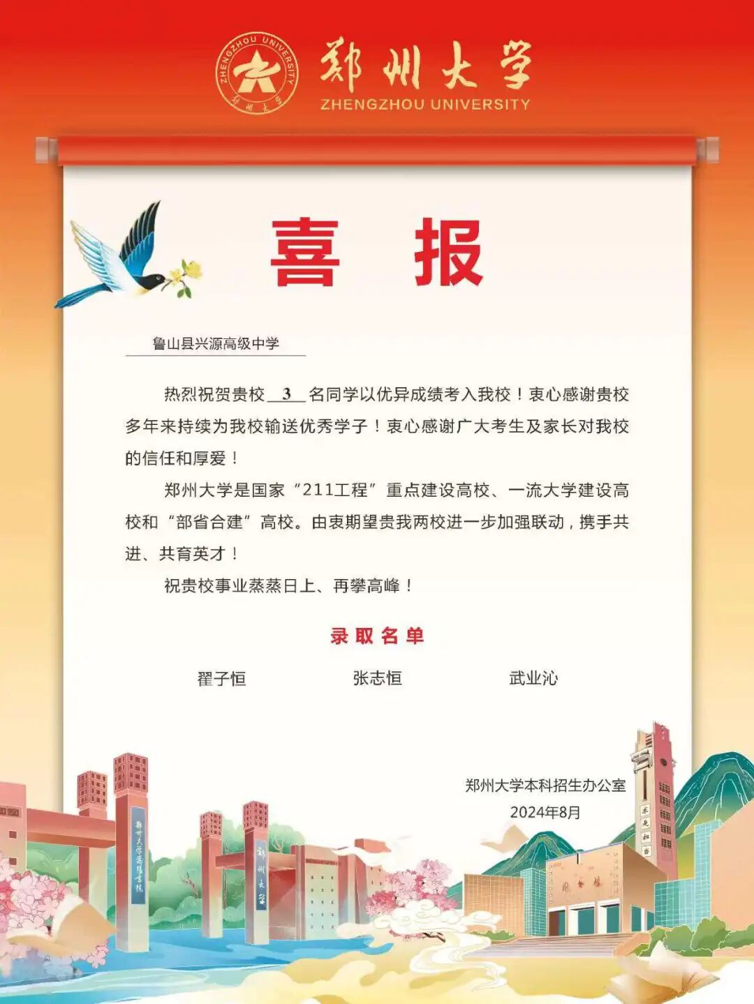 辛勤耕耘结硕果,在县委、县政府的正确领导下,在鲁山一高的示范引领下,在我校全体师生的共同努力下,鲁山县兴源高级中学2024年高考再创佳绩!