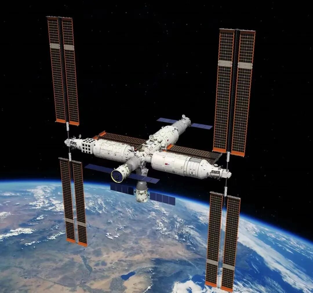 中国空间站三舱“T”字基本构型示意图,左侧为问天实验舱,右侧为梦天实验舱,中间由近及远分别为神舟飞船、天和核心舱、天舟飞船,下方为神舟飞船(五院供图)