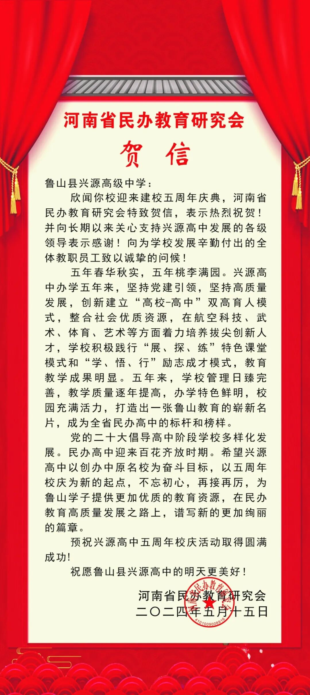 欣闻你校迎来建校五周年庆典,河南省民办教育研究会特致贺信,表示热烈祝贺!并向长期以来关心支持兴源高中发展的各级领导表示感谢!向为学校发展辛勤付出的全体教职员工致以诚挚的问候!