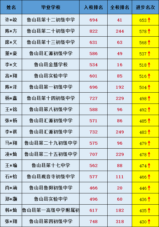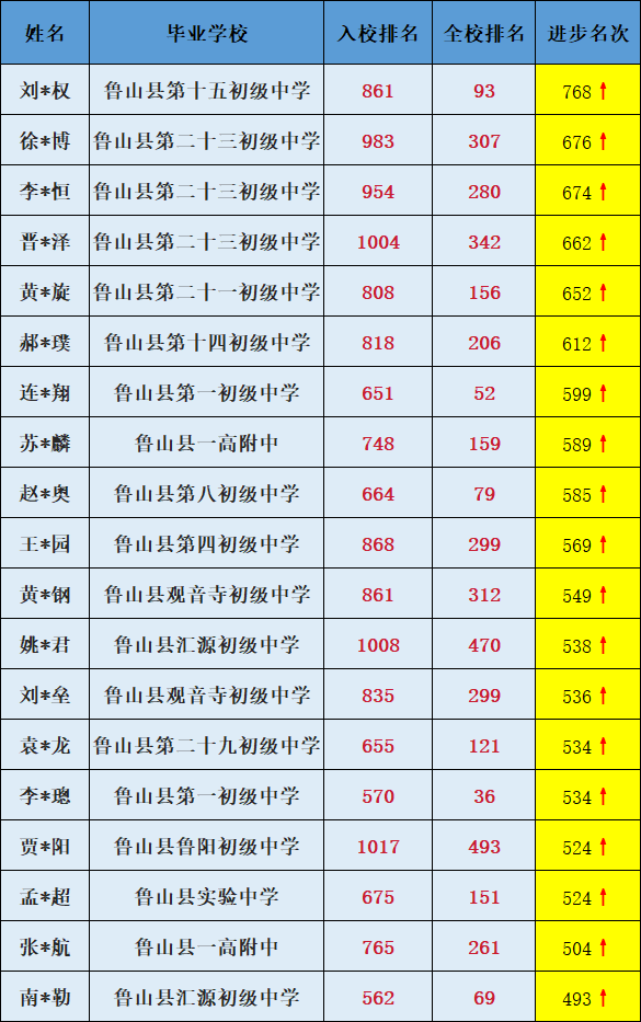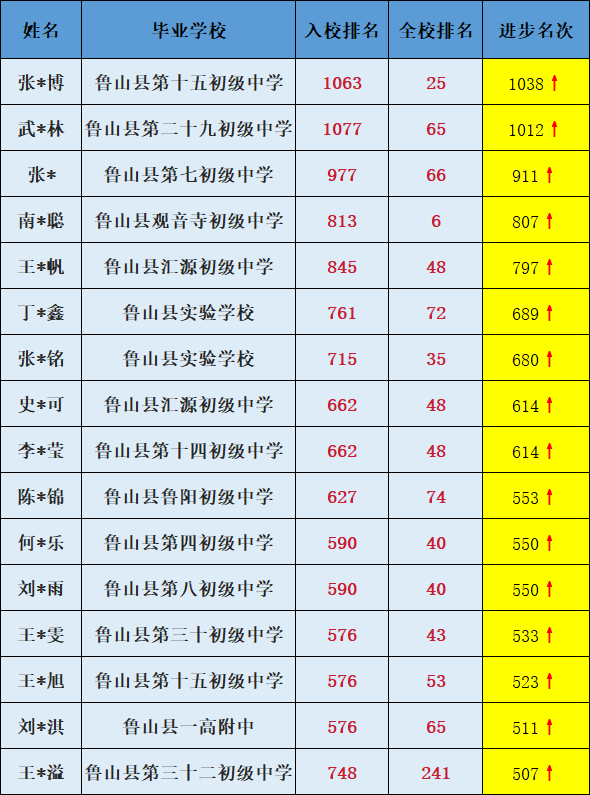 为能够体现同学们在兴源高中三年的努力成果,学校将同学们在当年的入校排名与现在的联考排名进行对比,特挑选出进步较大的同学(部分)以资鼓励。以张*博同学为例,入校排名是1063名,经过三年刻苦学习,现全校排名25名,进步名次1038位次;武*林同学入校排名1077名,现如今全校排名65名,进步名次1012位次。三年时光,学子们1095个奋斗拼搏的日子里,学生苦学、教师苦教、领导苦干,那些挑灯夜读的日子,那些写下的满页笔记,终将在此刻体现它的意义。再次体现了兴源高中“不比入口比出口,不比名次比进步”的成绩观念!
