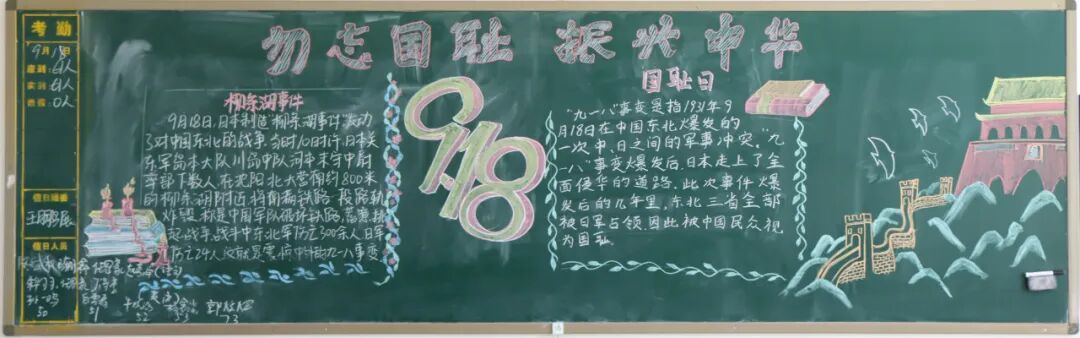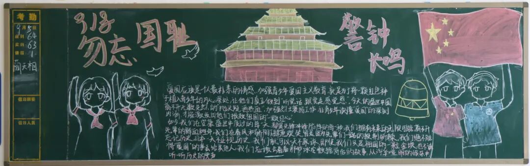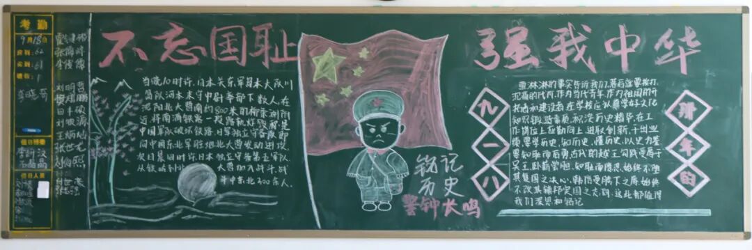 为了激发学生的爱国主义情感,班会后,学校开展了勿忘国耻,吾辈自强为主题的作文展、黑板报。通过一系列宣传教育活动使学生们更加了解历史知识,同时也抒发了对祖国的热爱。