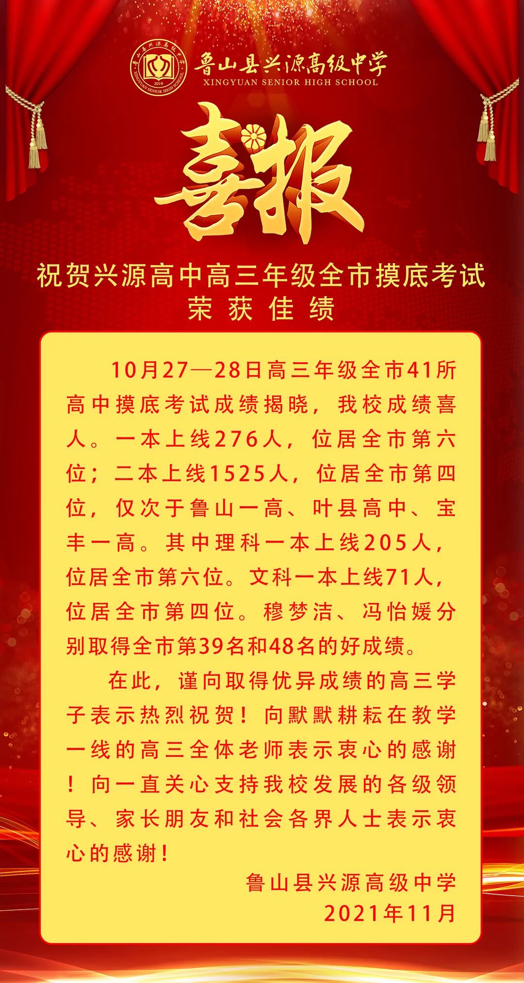 兴源高中高三年级在10月27—28日全市41所高中摸底考试成绩中一本上线276人,位居全市第六位;二本上线1525人,位居全市第四位,仅次于鲁山一高、叶县高中、宝丰一高。其中理科一本上线205人,位居全市第六位。文科一本上线71人,位居全市第四位。穆梦洁、冯怡媛分别取得全市第39名和48名的好成绩。希望各位老师再接再厉、奋力拼搏,把学校教育教学质量推上新的台阶。
