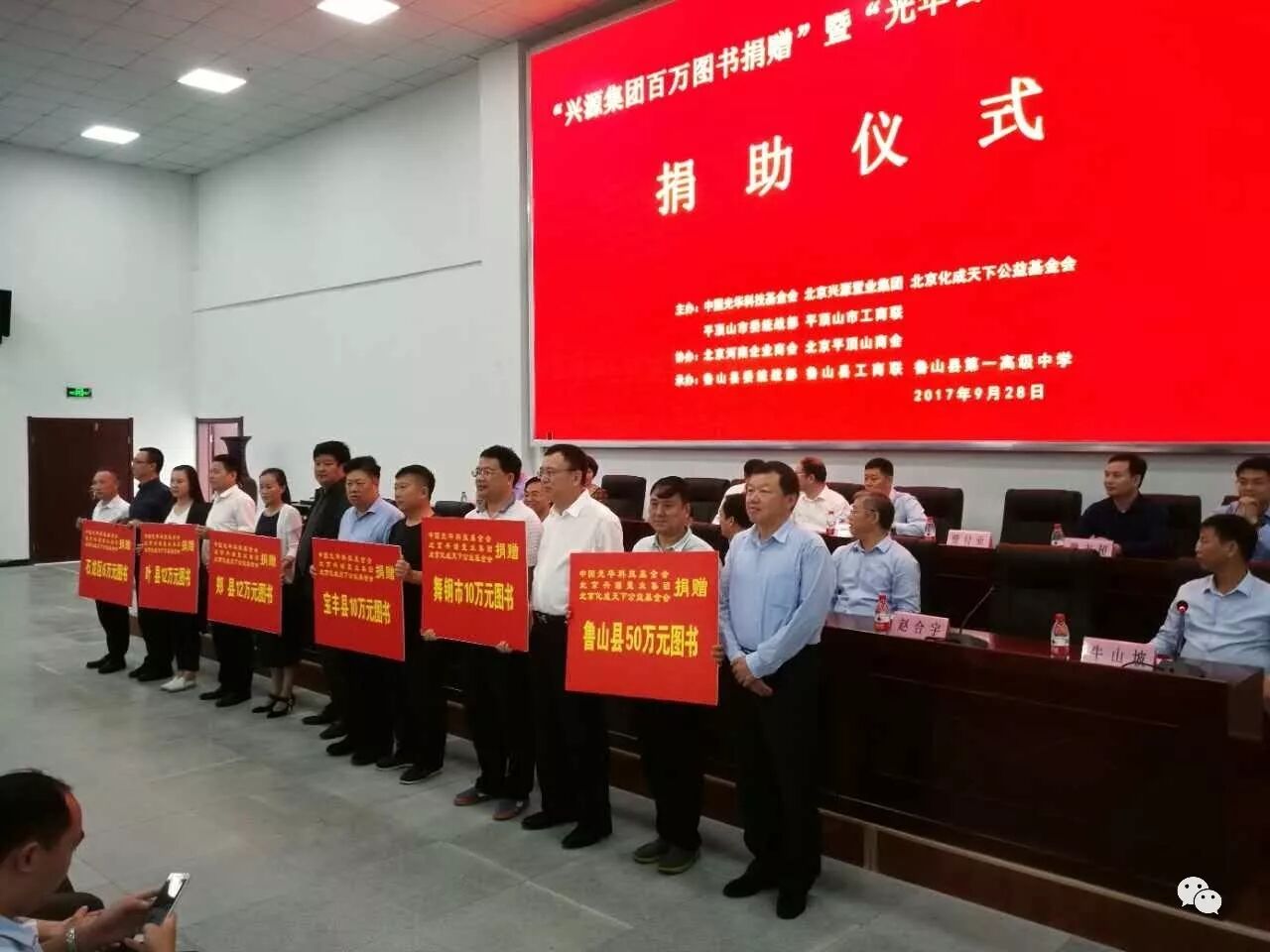 会上,北京兴源置业集团、北京化成天下基金会、中国光华科技基金会共向全市有扶贫任务的6个县市区捐助价值100万元的图书,其中鲁山县50万元。