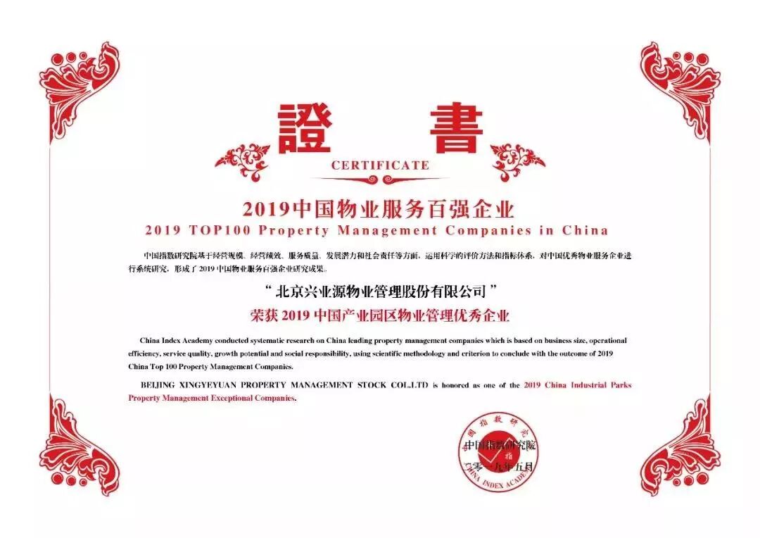 多年来兴业源物业所管理的项目,先后荣获过北京市住建委颁发的市级优秀管理单位及示范单位、首都绿化美化花园式单位、地区级优秀管理单位及优秀单位等奖项。兴业源物业一直倡导和积极参加各项慈善活动,并获得社会好评。2019年兴业源物业以其优异的表现荣膺“2019中国物业服务百强企业”、“2019中国产业园区物业管理优秀企业”荣誉。