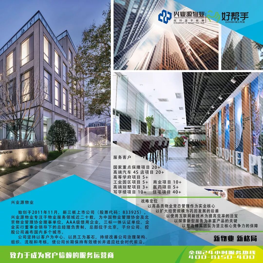 兴业源物业在原有物业服务基础上,不断开阔思路,拓宽服务领域,积极探索行业转型升级。借助互联网、移动互联网、物联网、云计算等新兴信息科技,通过线上公众平台与线下服务体验的结合,多渠道发掘客户需求,努力为业主提供安全、便利、舒适的现代化、智慧化工作和生活环境,解决业主工作生活中的各种问题。“好帮手”是兴业源旗下各类管理产品中专门针对物业日常管理的子品牌,旨在通过我们的悉心照料,让社区业主们真正享受到愉悦、放心的生活环境。兴业物业通过不断转变观念、创新思路,为社区业主们提供全方位的服务,致力成为业主满意的社区生活的好帮手。