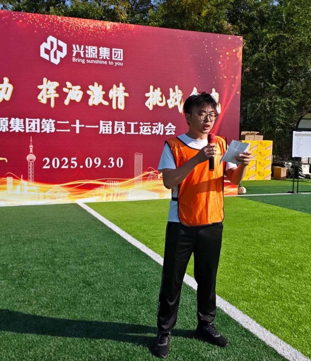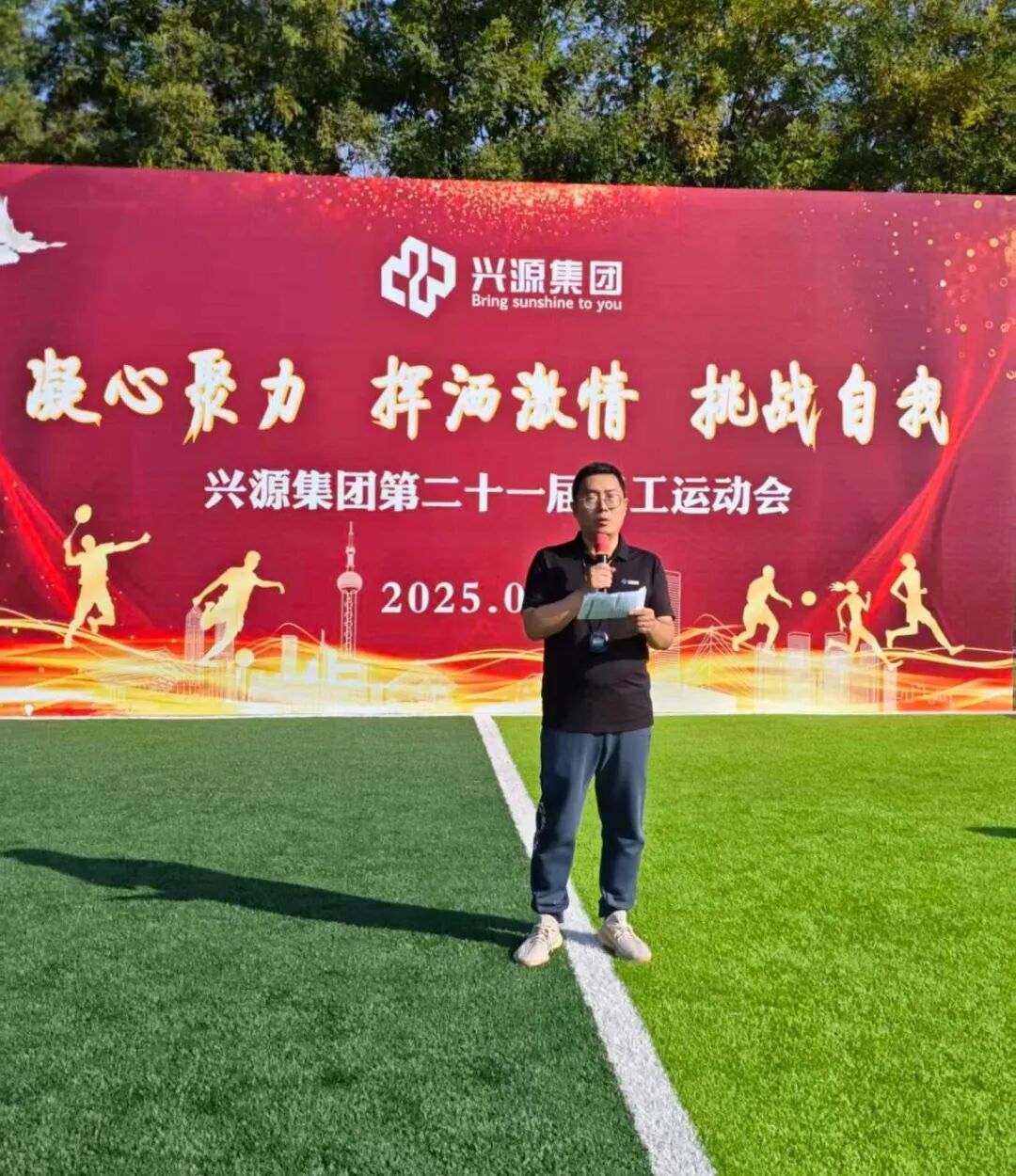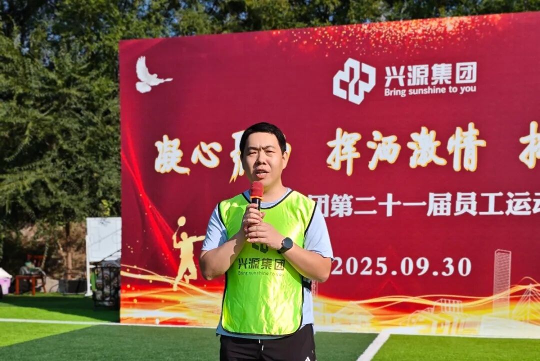 在庄严的运动员入场式和宣誓仪式后,兴源集团财务副总监秦玉波先生致开幕词。他向所有参与者致以亲切问候,并对筹备人员表示感谢。秦总强调,希望运动员们发扬“友谊第一,比赛第二”的风格,赛出水平、赛出风采,并通过运动会凝聚人心、挑战自我,将拼搏协作的态度转化为推动集团发展的强大动力。