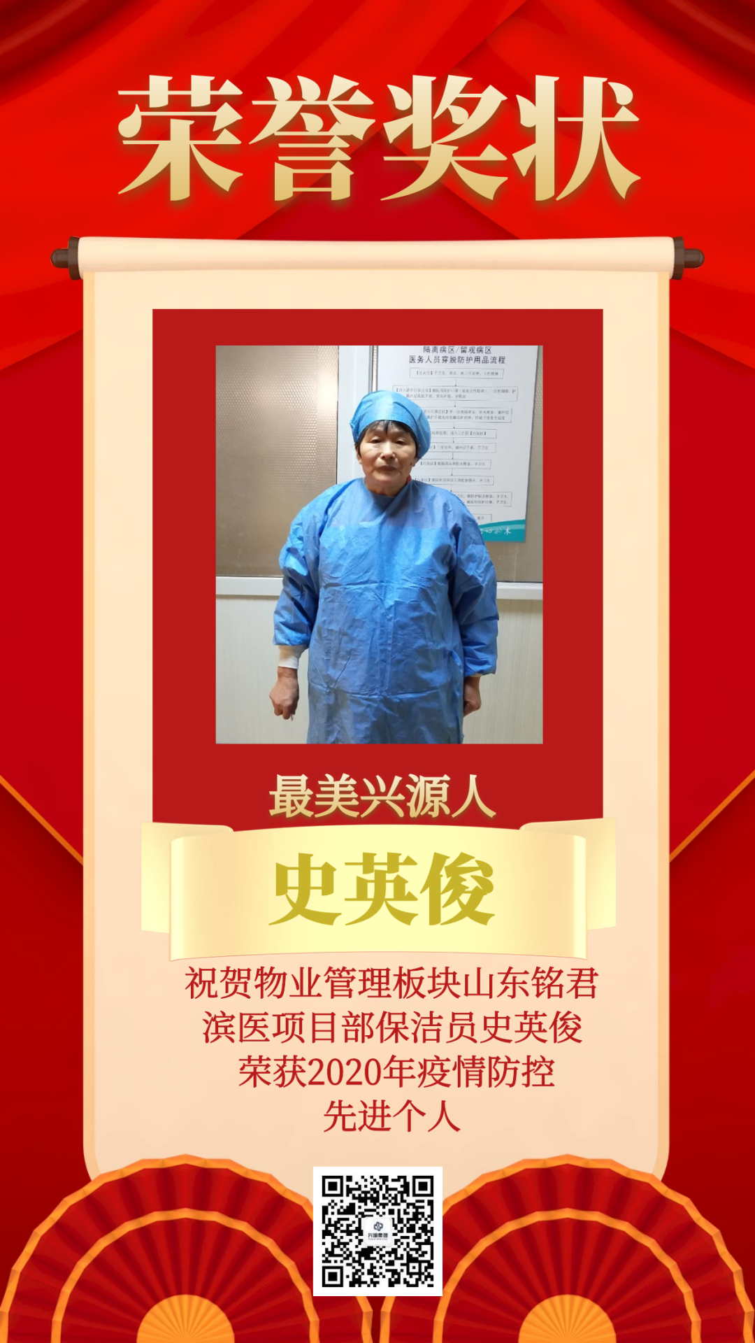 疫情期间,本该在家休息的她,不顾家人的“威胁”和反对,毅然决然地走上了疫情期间物业行业最危险的岗位,主动承担起了滨医新冠肺炎隔离区的卫生保洁工作。从1月24日(除夕)进入隔离区,至2月11日确诊患者出院,整整19天的时间,她与确诊患者朝夕相处,每天任劳任怨的工作着。完成任务离开隔离区后,又进入14天的隔离期,至今还在滨医隔离病房留院观察,无法回家与家人团聚。她用自己的实际行动诠释着兴源物业人的担当和服务精神。