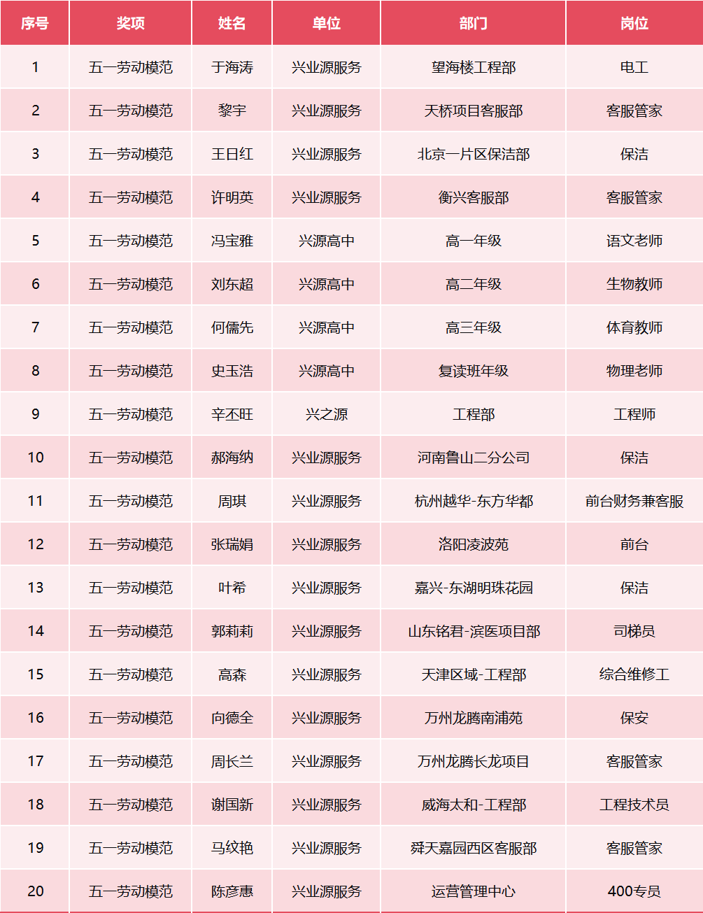 此次荣获“五一劳动模范”的同事共有20位,名单如下