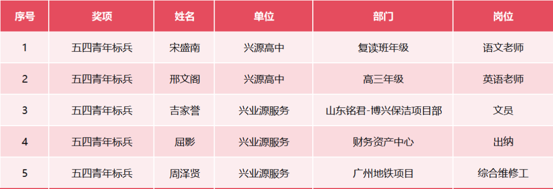 荣获“五四青年标兵”的同事有5位,名单如下