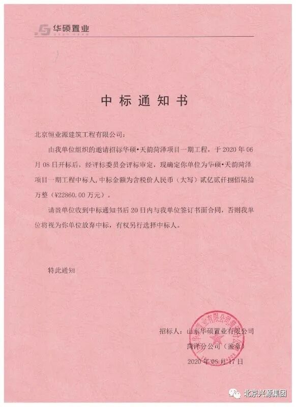 2020年6月17日,北京兴源控股集团旗下恒业源建筑公司成功中标华硕•天韵菏泽项目一期工程。
