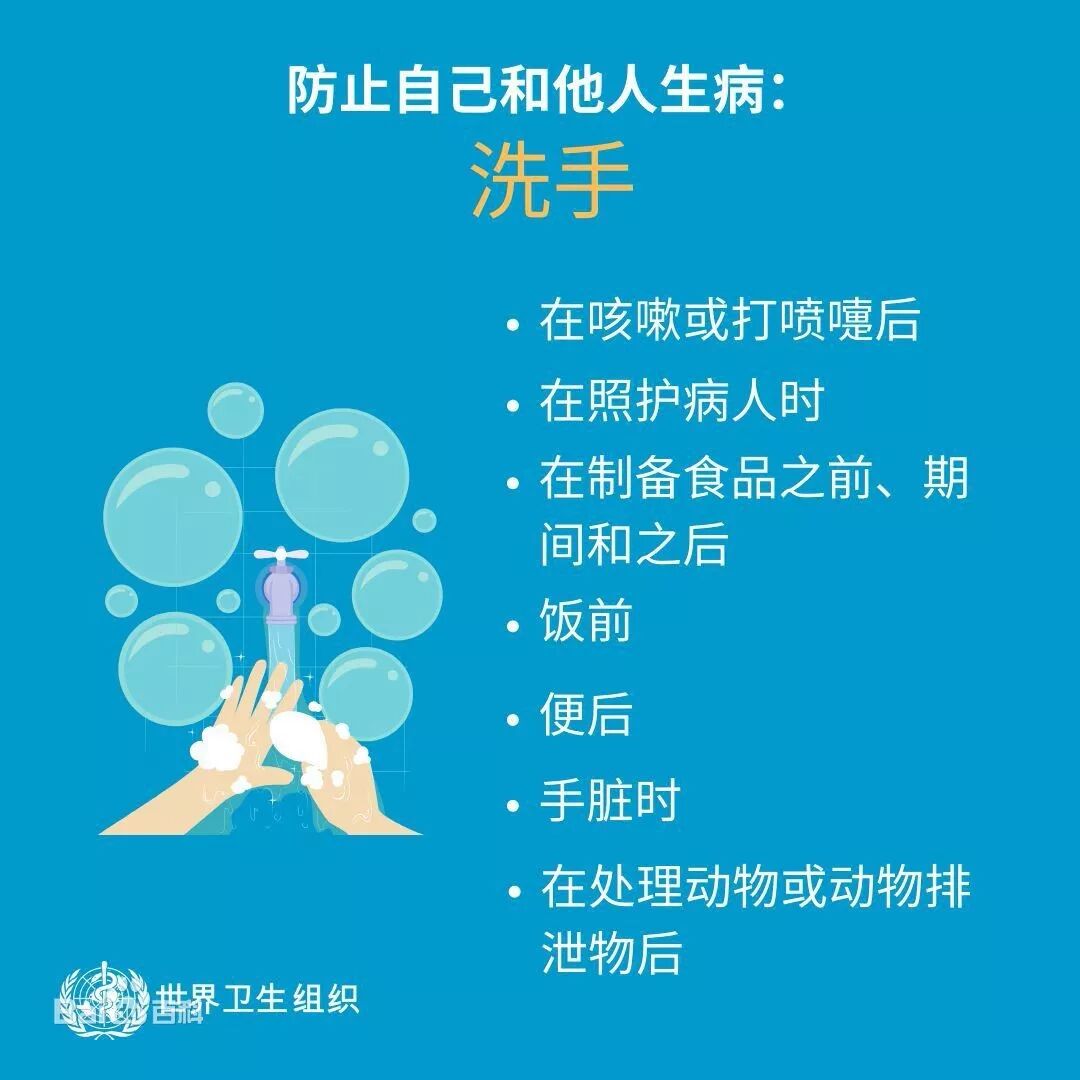 2.勤洗手。尤其在手被呼吸道分泌物污染时、触摸过公共设施后、照顾发热呼吸道感染或呕吐腹泻病人后、探访医院后、处理被污染的物品以及接触动物、动物饲料或动物粪便后。
