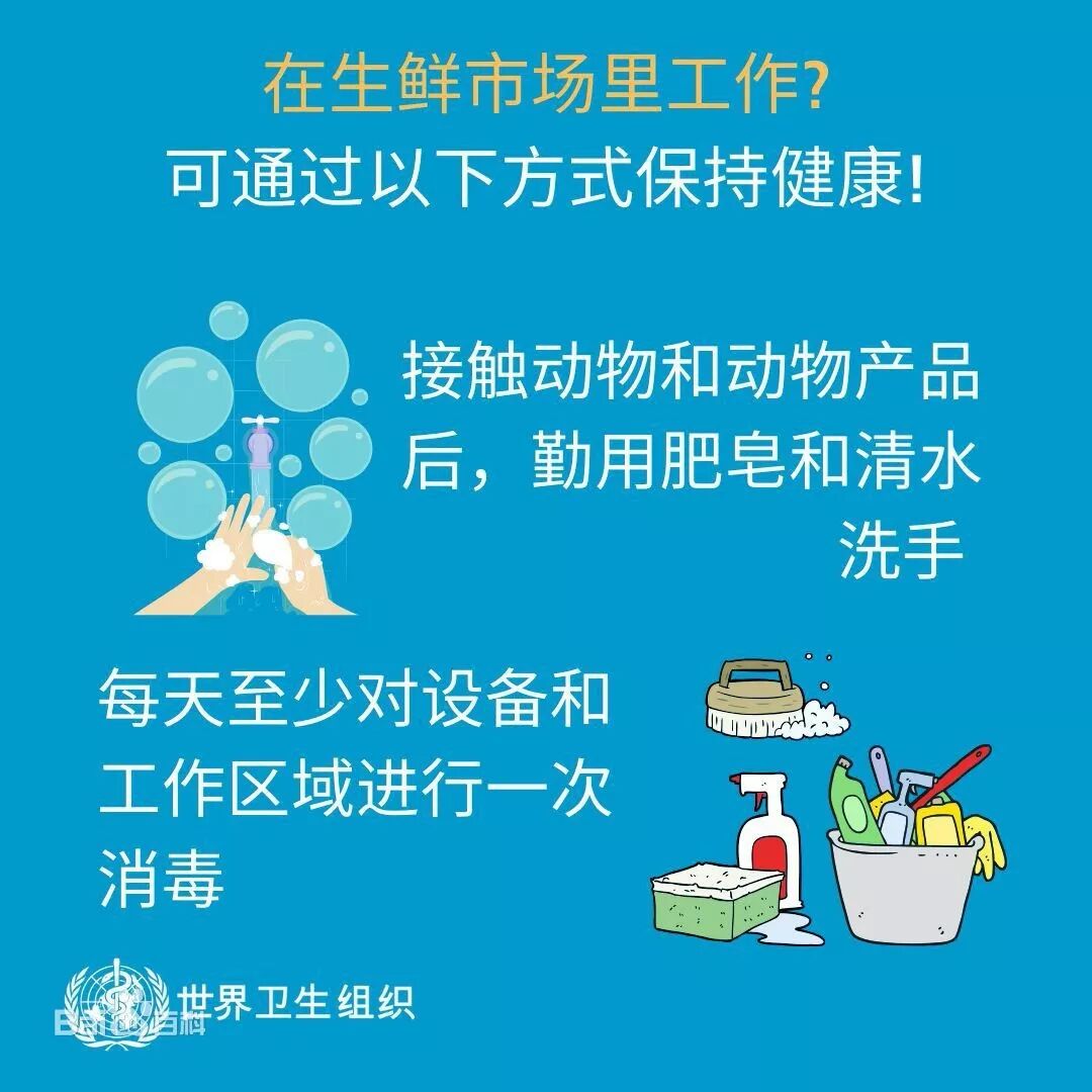 2.避免前往动物农场和屠宰场、活禽动物交易市场或摊位、野生动物栖息地或等场所。必须前往时要做好防护,尤其是职业暴露人群。